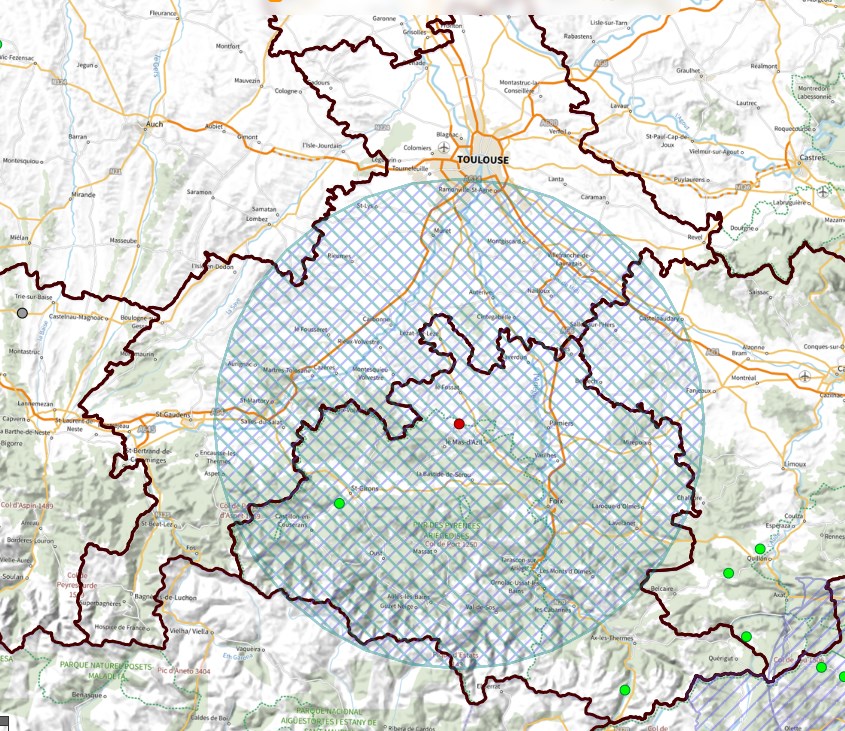 - dans un rayon de 20 km, en zone de protection (sur 18 communes : Bax (31047), Canens (31103), Castagnac (31111), Esperce (31173),Gaillac-Toulza (31206), Gouzens (31226), Lacaugne (31258), Lahitère (31267), Lapeyrère (31272), Latour (31279), Latrape (31280), Mailholas (31312), Marliac (31319), Massabrac (31326), Montberaud (31362), Montbrun-Bocage (31365), Montesquieu-Volvestre (31375), Rieux-Volvestre (31455).